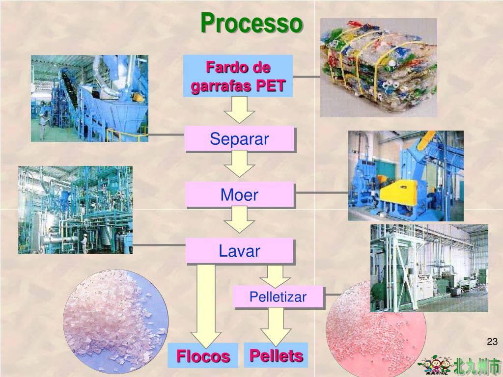 Processo Fardode garrafas PET Separar Moer Lavar Pelletizar Pellets Flocos