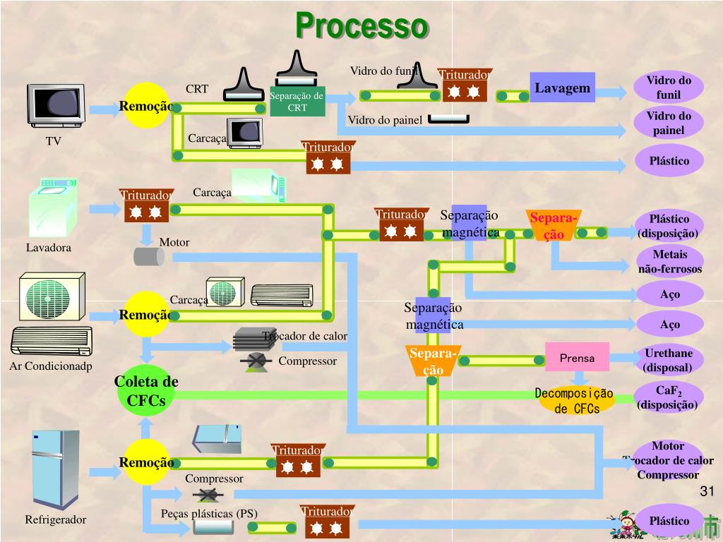 Processo Triturador Triturador Triturador Triturador Triturador Triturador Vidro do funil Vidro dofunil Lavagem CRT Remoção Separação de CRT Vidro dopainel Vidro do painel Carcaça TV Plástico Carcaça Separaçãomagnética Plástico(disposição) Separa-ção Motor Lavadora Metaisnão-ferrosos Aço Carcaça Remoção Separaçãomagnética Aço Trocador de calor Prensa Urethane(disposal) Separa-ção Compressor ArCondicionadp Coleta deCFCs CaF2 (disposição) Decomposiçãode CFCs Remoção MotorTrocador de calorCompressor Compressor Plástico Peçasplásticas (PS) Refrigerador