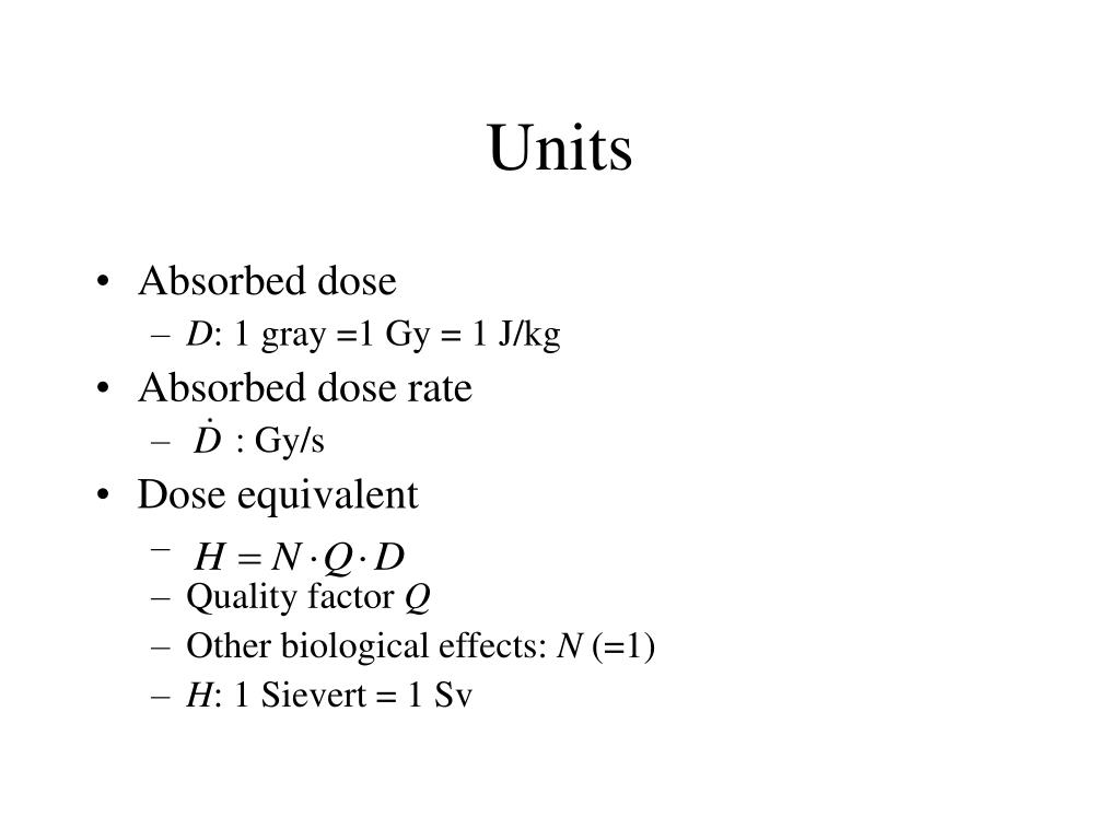 Units • Absorbed dose • D: 1 gray =1 Gy = 1 J/kg • Absorbed dose rate • : Gy/s • Dose equivalent • Quality factor Q • Other biological effects: N (=1) • H: 1 Sievert = 1 Sv