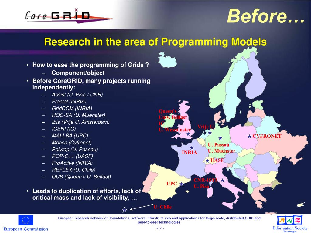 Before… Research in the area of Programming Models • How to ease the programming of Grids ? • Component/object • Before CoreGRID, many projects running independently: • Assist (U. Pisa / CNR) • Fractal (INRIA) • GridCCM (INRIA) • HOC-SA (U. Muenster) • Ibis (Vrije U. Amsterdam) • ICENI (IC) • MALLBA (UPC) • Mocca (Cyfronet) • Polytop (U. Passau) • POP-C++ (UASF) • ProActive (INRIA) • REFLEX (U. Chile) • QUB (Queen’s U. Belfast) • Leads to duplication of efforts, lack of critical mass and lack of visibility, … Queen’s Univ. Belfast IC U. Wesminster Vrije U. CYFRONET U. Passau U. Muenster INRIA UASF CNR-ISTI U. Pisa UPC U. Chile European research network on foundations, software Infrastructures and applications for large-scale, distributed GRID and peer-to-peer technologies