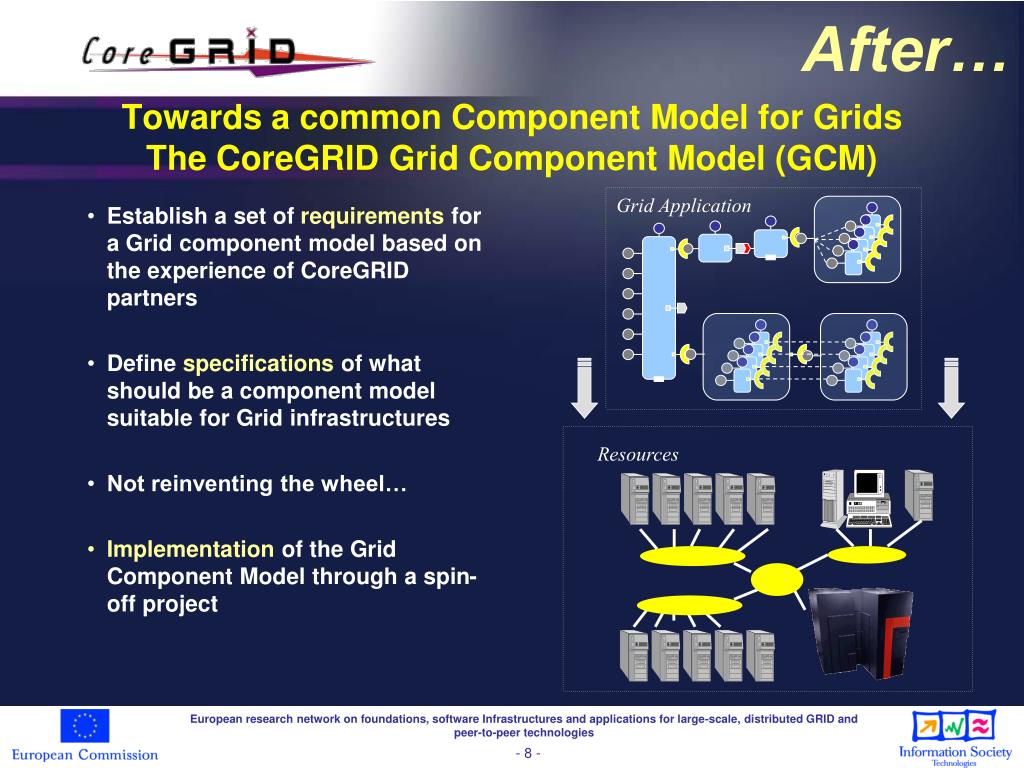 After… Towards a common Component Model for GridsThe CoreGRID Grid Component Model (GCM) Grid Application • Establish a set of requirements for a Grid component model based on the experience of CoreGRID partners • Define specifications of what should be a component model suitable for Grid infrastructures • Not reinventing the wheel… • Implementation of the Grid Component Model through a spin-off project Resources European research network on foundations, software Infrastructures and applications for large-scale, distributed GRID and peer-to-peer technologies