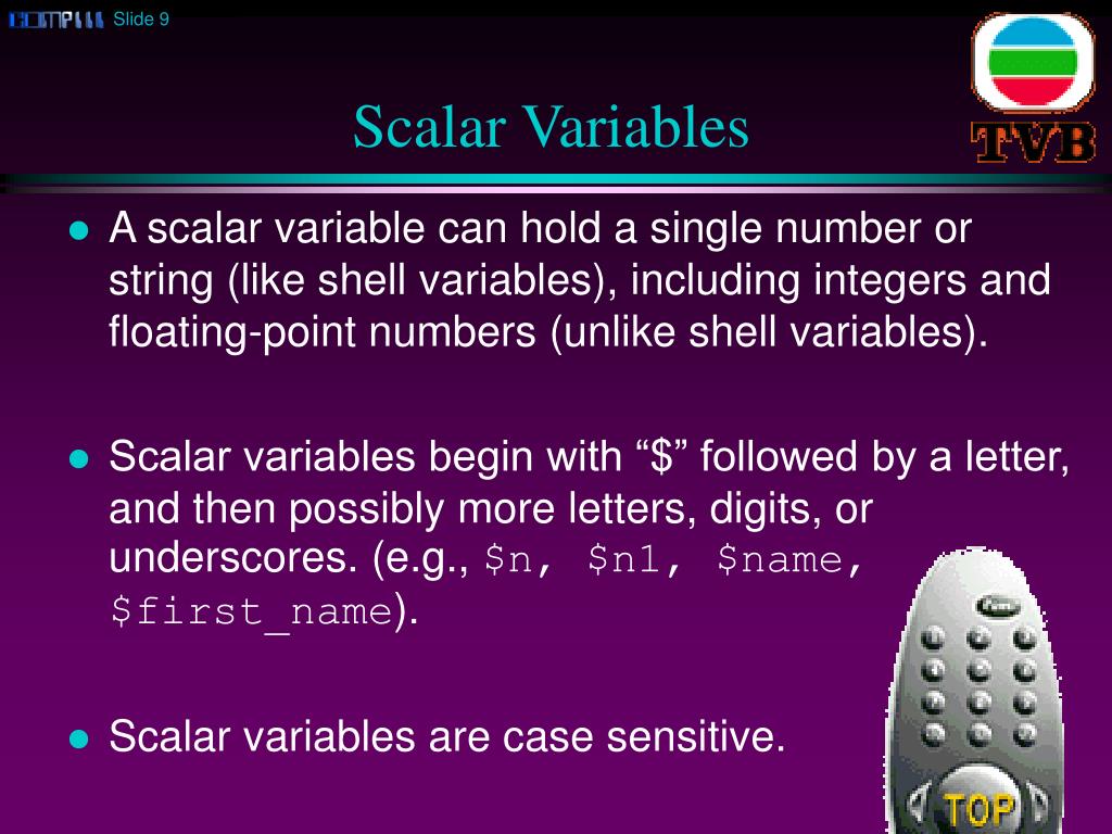 Scalar Variables • A scalar variable can hold a single number or string (like shell variables), including integers and floating-point numbers (unlike shell variables). • Scalar variables begin with “$” followed by a letter, and then possibly more letters, digits, or underscores. (e.g., $n, $n1, $name, $first_name). • Scalar variables are case sensitive.