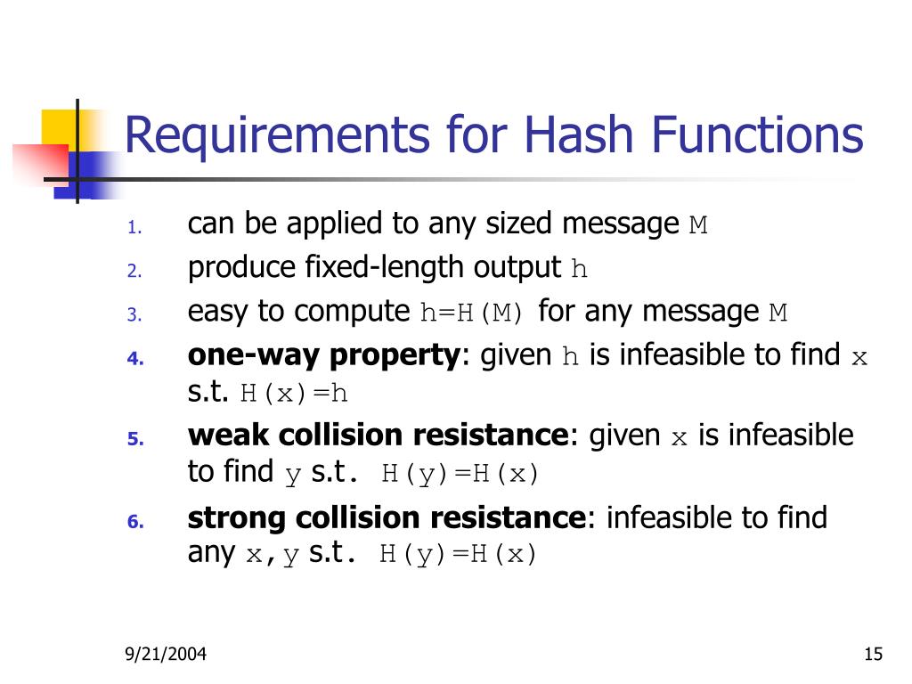 Requirements for Hash Functions • can be applied to any sized message M • produce fixed-length output h • easy to compute h=H(M) for any message M • one-way property:given h is infeasible to find x s.t. H(x)=h • weak collision resistance: given x is infeasible to find y s.t. H(y)=H(x) • strong collision resistance: infeasible to find any x,y s.t. H(y)=H(x)