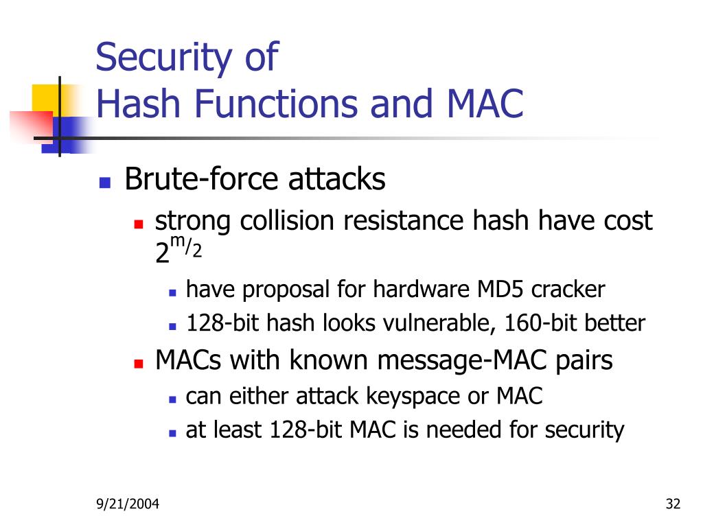 Security ofHash Functions and MAC • Brute-force attacks • strong collision resistance hash have cost 2m/2 • have proposal for hardware MD5 cracker • 128-bit hash looks vulnerable, 160-bit better • MACs with known message-MAC pairs • can either attack keyspace or MAC • at least 128-bit MAC is needed for security