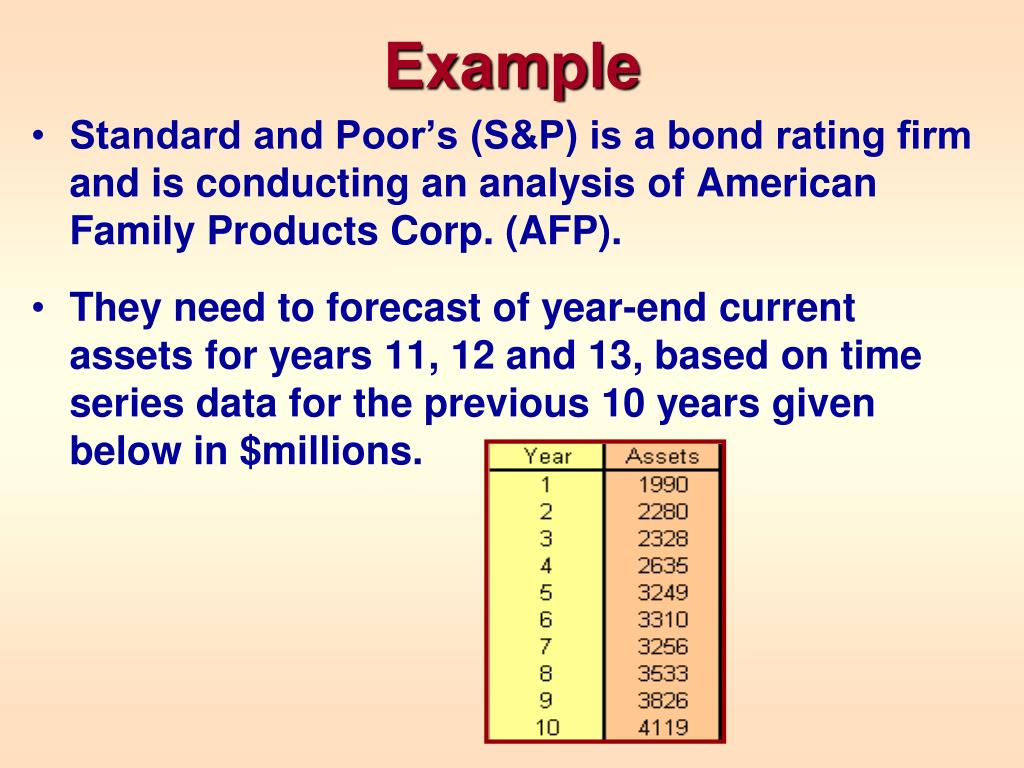 Example • Standard and Poor’s (S&P) is a bond rating firm and is conducting an analysis of American Family Products Corp. (AFP). • They need to forecast of year-end current assets for years 11, 12 and 13, based on time series data for the previous 10 years given below in $millions.
