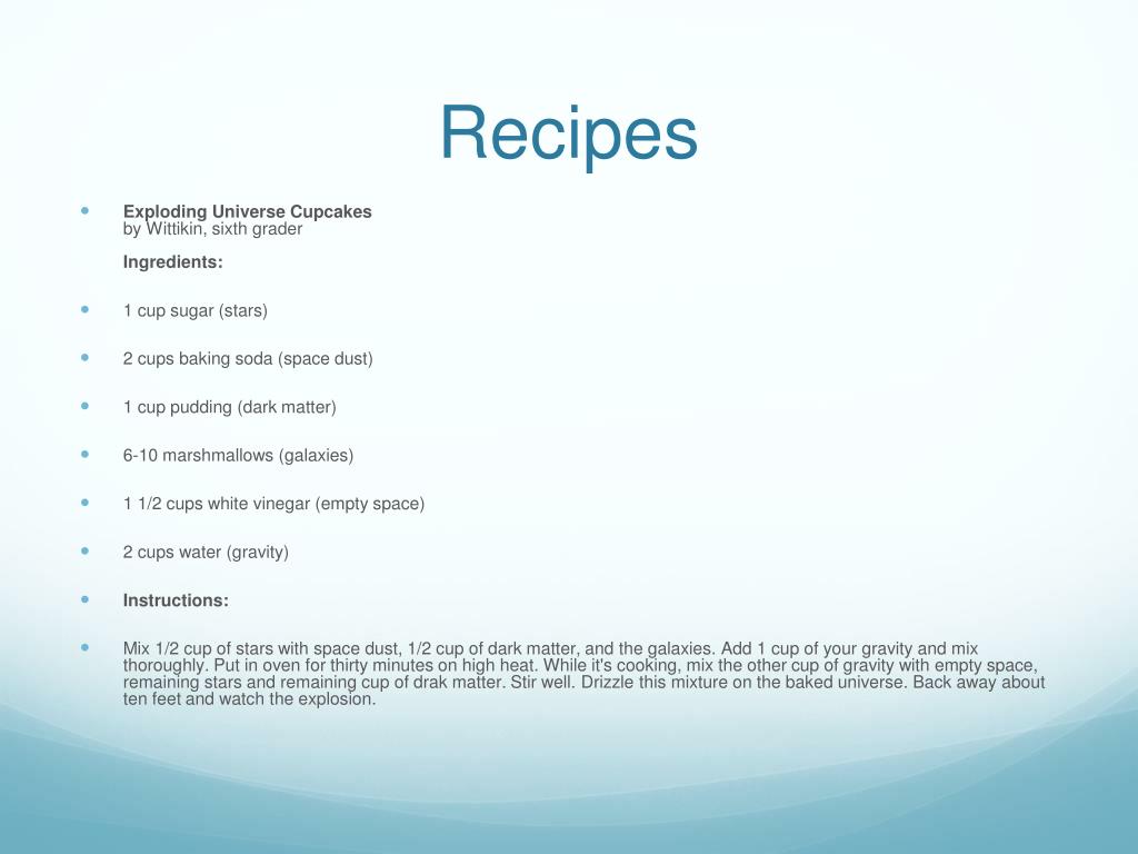 Recipes • Exploding Universe Cupcakesby Wittikin, sixth graderIngredients: • 1 cup sugar (stars) • 2 cups baking soda (space dust) • 1 cup pudding (dark matter) • 6-10 marshmallows (galaxies) • 1 1/2 cups white vinegar (empty space) • 2 cups water (gravity) • Instructions: • Mix 1/2 cup of stars with space dust, 1/2 cup of dark matter, and the galaxies. Add 1 cup of your gravity and mix thoroughly. Put in oven for thirty minutes on high heat. While it's cooking, mix the other cup of gravity with empty space, remaining stars and remaining cup of drak matter. Stir well. Drizzle this mixture on the baked universe. Back away about ten feet and watch the explosion.