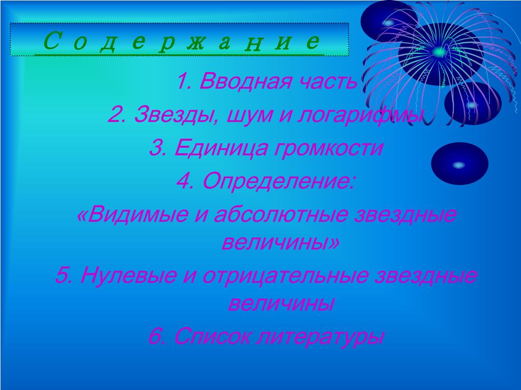 Содержание 1. Вводная часть 2. Звезды, шум и логарифмы 3. Единица громкости 4. Определение: «Видимые и абсолютные звездные величины» 5. Нулевые и отрицательные звездные величины 6. Список литературы