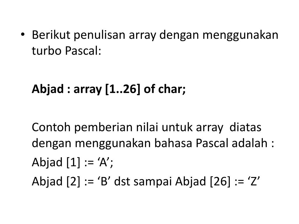 Berikut penulisan array dengan menggunakan turbo Pascal: Abjad : array [1..26] of char; Contoh pemberian nilai untuk array diatas dengan menggunakan bahasa Pascal adalah : Abjad [1] := ‘A’; Abjad [2] := ‘B’ dst sampai Abjad [26] := ‘Z’