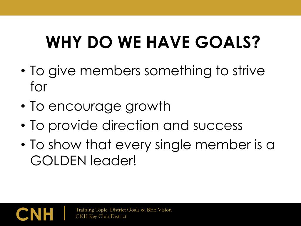 WHY DO WE HAVE GOALS? To give members something to strive for To encourage growth To provide direction and success To show that every single member is a GOLDEN leader!