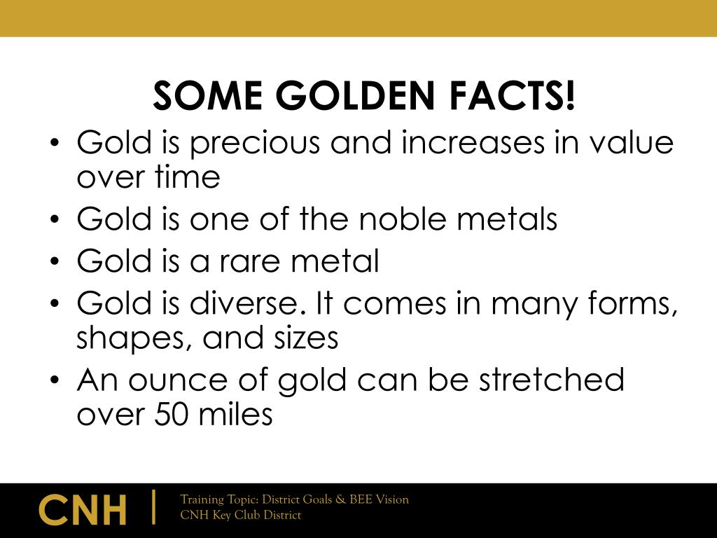 SOME GOLDEN FACTS! Gold is precious and increases in value over time Gold is one of the noble metals Gold is a rare metal Gold is diverse. It comes in many forms, shapes, and sizes An ounce of gold can be stretched over 50 miles