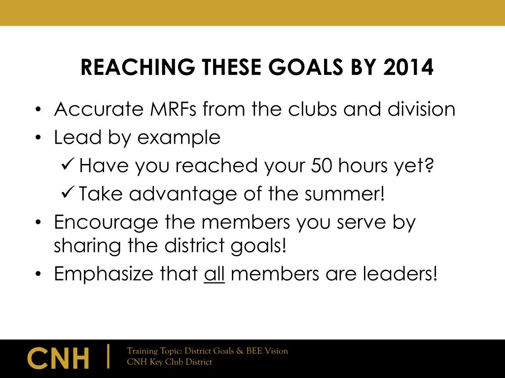REACHING THESE GOALS BY 2014 Accurate MRFs from the clubs and division Lead by example Have you reached your 50 hours yet? Take advantage of the summer! Encourage the members you serve by sharing the district goals! Emphasize that all members are leaders!