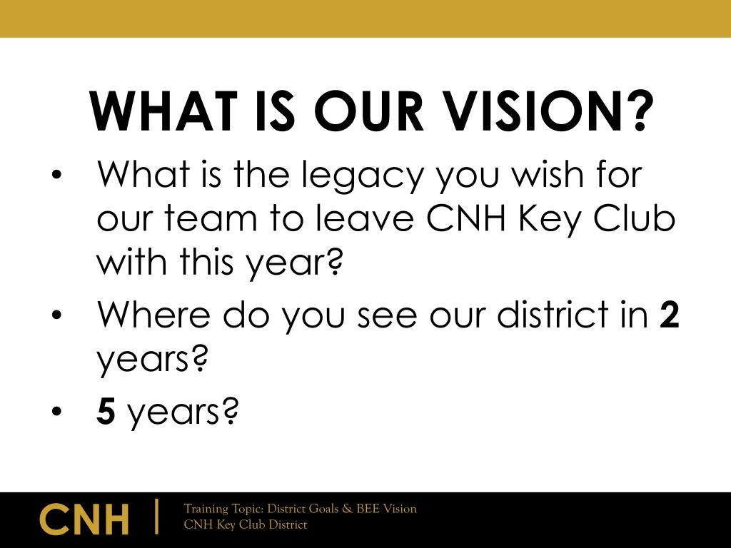 WHAT IS OUR VISION? What is the legacy you wish for our team to leave CNH Key Club with this year? Where do you see our district in 2 years? 5 years?