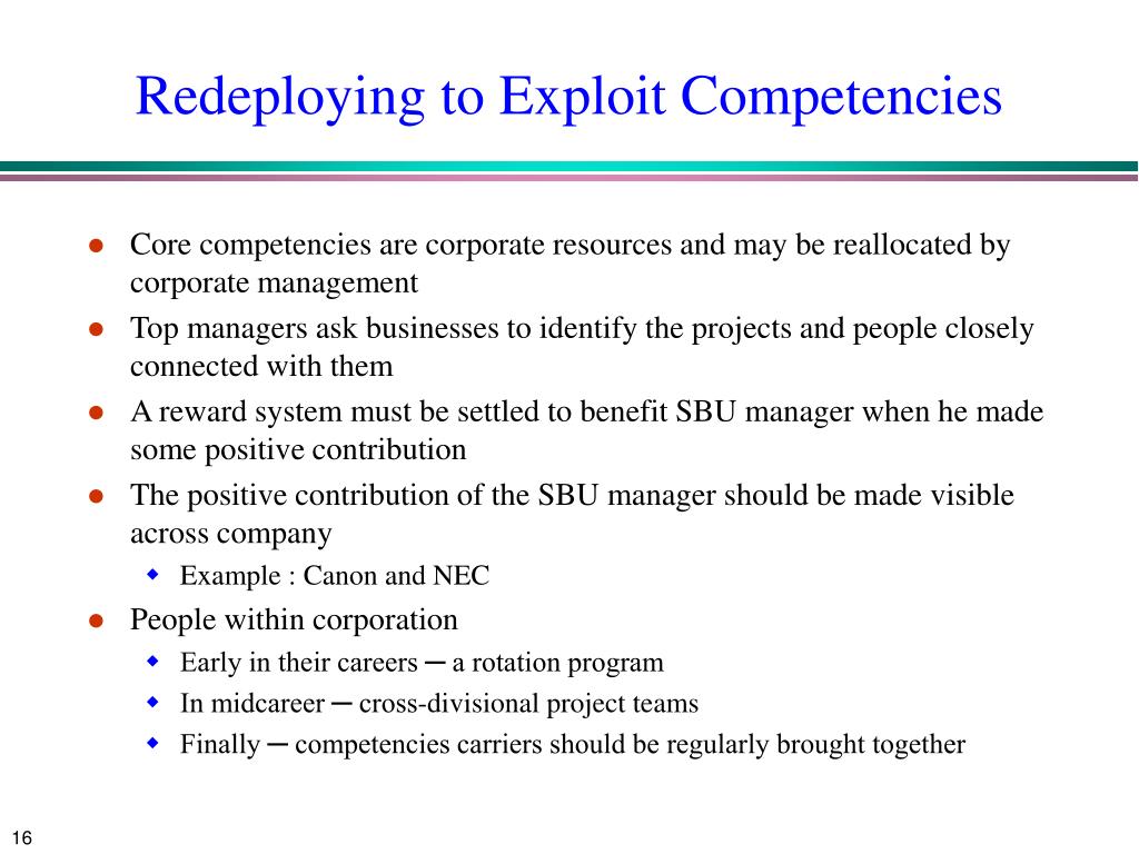 Redeploying to Exploit Competencies • Core competencies are corporate resources and may be reallocated by corporate management • Top managers ask businesses to identify the projects and people closely connected with them • A reward system must be settled to benefit SBU manager when he made some positive contribution • The positive contribution of the SBU manager should be made visible across company • Example : Canon and NEC • People within corporation • Early in their careers ─ a rotation program • In midcareer ─ cross-divisional project teams • Finally ─ competencies carriers should be regularly brought together