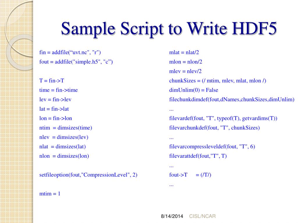 Sample Script to Write HDF5 fin = addfile(“uvt.nc", "r") fout = addfile("simple.h5", "c”) T = fin->T time = fin->time lev = fin->lev lat = fin->lat lon = fin->lon ntim = dimsizes(time) nlev = dimsizes(lev) nlat = dimsizes(lat) nlon = dimsizes(lon) setfileoption(fout,"CompressionLevel", 2) mtim = 1 mlat = nlat/2 mlon = nlon/2 mlev = nlev/2 chunkSizes = (/ mtim, mlev, mlat, mlon /) dimUnlim(0) = False filechunkdimdef(fout,dNames,chunkSizes,dimUnlim) ... filevardef(fout, "T", typeof(T), getvardims(T)) filevarchunkdef(fout, "T", chunkSizes) ... filevarcompressleveldef(fout, "T", 6) filevarattdef(fout,"T", T) ... fout->T = (/T/) ... CISL/NCAR