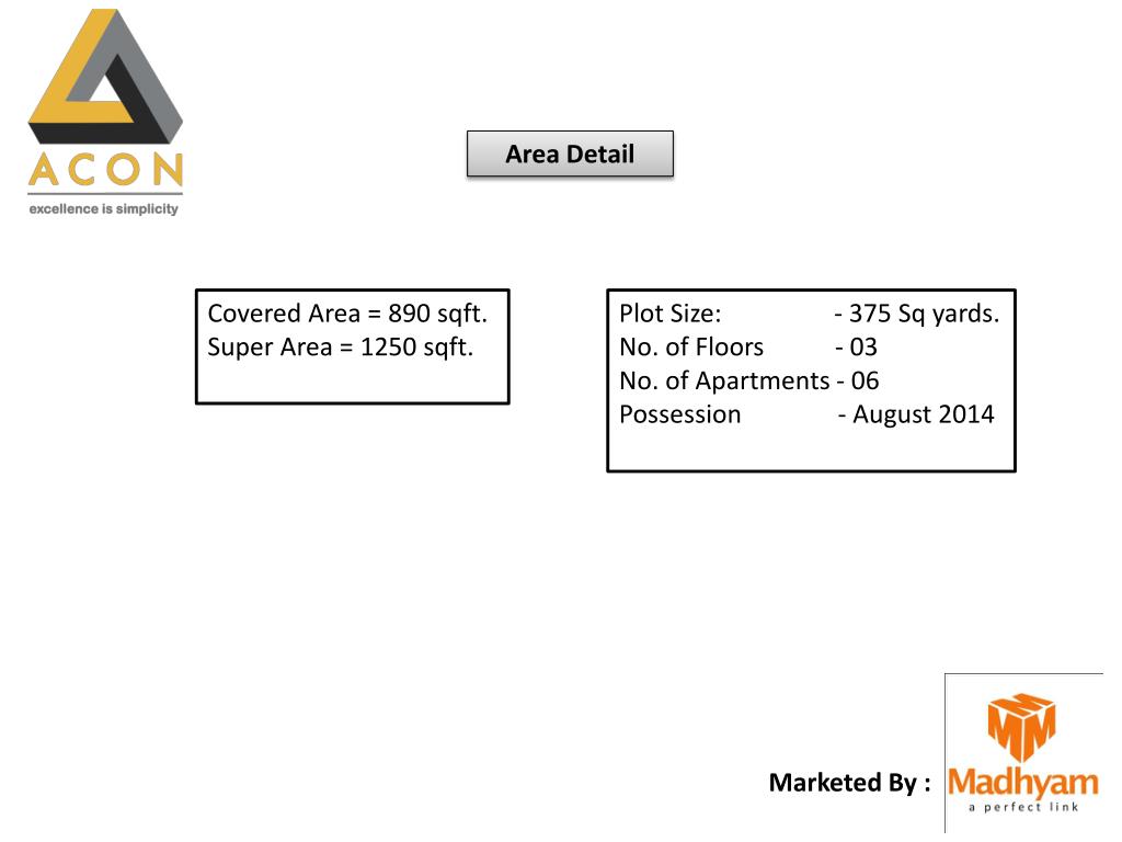Area Detail Covered Area = 890 sqft. Super Area = 1250 sqft. • Plot Size: - 375 Sq yards. • No. of Floors - 03 • No. of Apartments - 06 • Possession - August 2014 Marketed By :