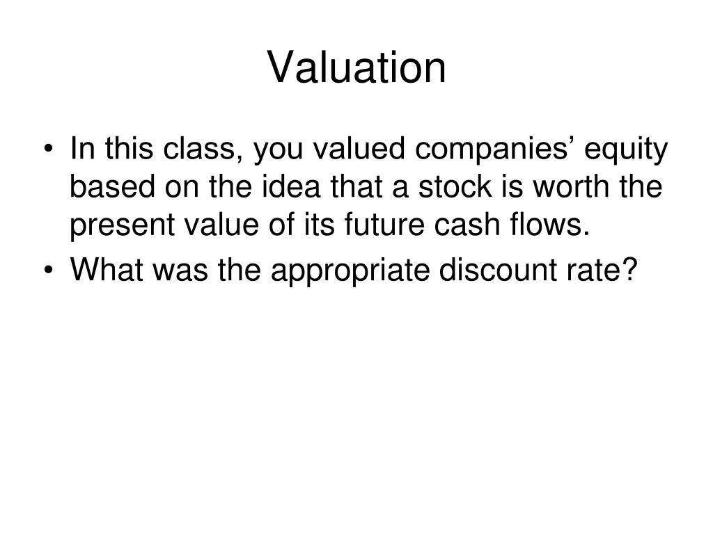 Valuation • In this class, you valued companies’ equity based on the idea that a stock is worth the present value of its future cash flows. • What was the appropriate discount rate?