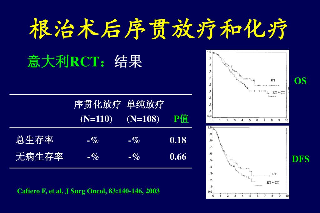 根治术后序贯放疗和化疗 意大利RCT:结果 OS 序贯化放疗 单纯放疗 (N=110) (N=108) P值 总生存率 -% -% 0.18 无病生存率 -% -% 0.66 DFS Cafiero F, et al. J Surg Oncol, 83:140-146, 2003