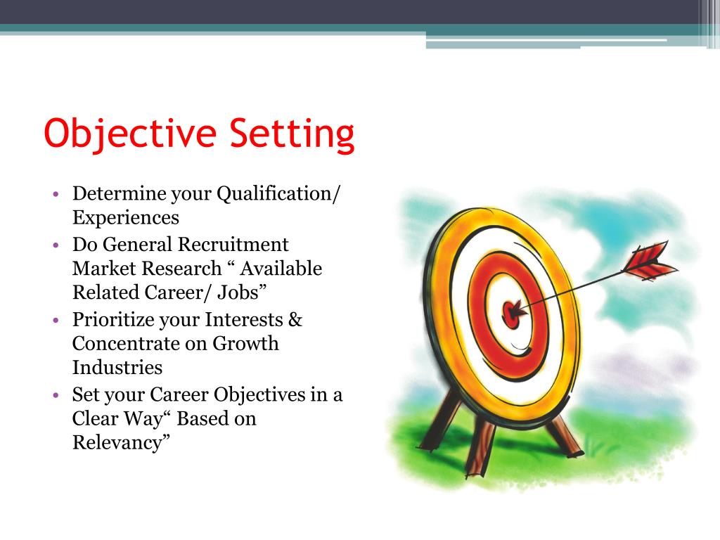 Objective Setting • Determine your Qualification/ Experiences • Do General Recruitment Market Research “ Available Related Career/ Jobs” • Prioritize your Interests & Concentrate on Growth Industries • Set your Career Objectives in a Clear Way“ Based on Relevancy”