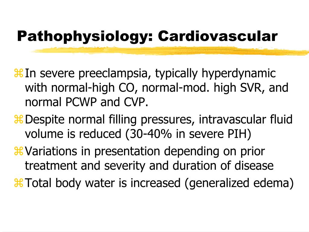 Pathophysiology: Cardiovascular • In severe preeclampsia, typically hyperdynamic with normal-high CO, normal-mod. high SVR, and normal PCWP and CVP. • Despite normal filling pressures, intravascular fluid volume is reduced (30-40% in severe PIH) • Variations in presentation depending on prior treatment and severity and duration of disease • Total body water is increased (generalized edema)