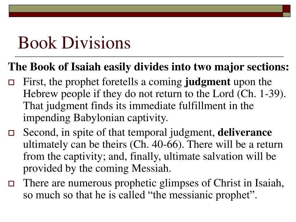 Book Divisions The Book of Isaiah easily divides into two major sections: • First, the prophet foretells a coming judgment upon the Hebrew people if they do not return to the Lord (Ch. 1-39). That judgment finds its immediate fulfillment in the impending Babylonian captivity. • Second, in spite of that temporal judgment, deliverance ultimately can be theirs (Ch. 40-66). There will be a return from the captivity; and, finally, ultimate salvation will be provided by the coming Messiah. • There are numerous prophetic glimpses of Christ in Isaiah, so much so that he is called “the messianic prophet”.