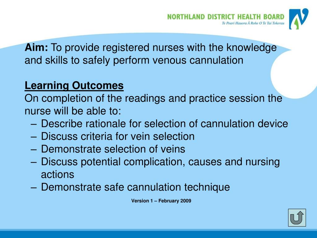 Aim: To provide registered nurses with the knowledge and skills to safely perform venous cannulation Learning Outcomes On completion of the readings and practice session the nurse will be able to: • Describe rationale for selection of cannulation device • Discuss criteria for vein selection • Demonstrate selection of veins • Discuss potential complication, causes and nursing actions • Demonstrate safe cannulation technique Version 1 – February 2009