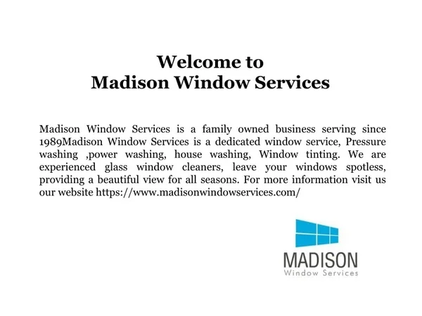 https://www.madisonwindowservices.com/ Welcome to Madison Window Services Madison Window Services is a family owned business serving since 1989Madison Window Services is a dedicated window service, Pressure washing ,power washing, house washing, Window tinting. We are experienced glass window cleaners, leave your windows spotless, providing a beautiful view for all seasons. For more information visit us our website https://www.madisonwindowservices.com/