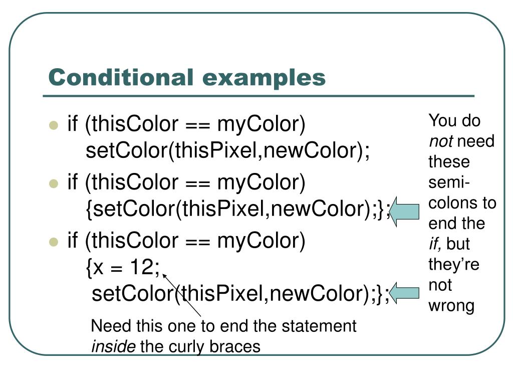 Conditional examples • if (thisColor == myColor) setColor(thisPixel,newColor); • if (thisColor == myColor) {setColor(thisPixel,newColor);}; • if (thisColor == myColor) {x = 12; setColor(thisPixel,newColor);}; You do not need these semi-colons to end the if, but they’re not wrong Need this one to end the statement inside the curly braces