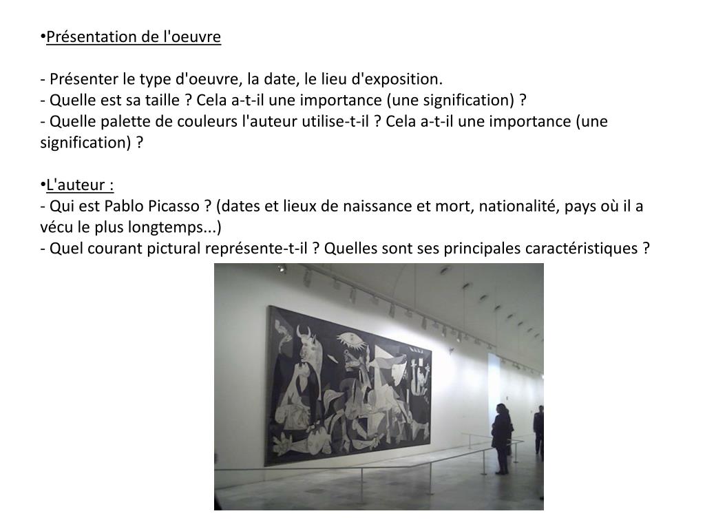 Présentation de l'oeuvre • - Présenter le type d'oeuvre, la date, le lieu d'exposition. • - Quelle est sa taille ? Cela a-t-il une importance (une signification) ? • - Quelle palette de couleurs l'auteur utilise-t-il ? Cela a-t-il une importance (une signification) ? • L'auteur : • - Qui est Pablo Picasso ? (dates et lieux de naissance et mort, nationalité, pays où il a vécu le plus longtemps...) • - Quel courant pictural représente-t-il ? Quelles sont ses principales caractéristiques ?