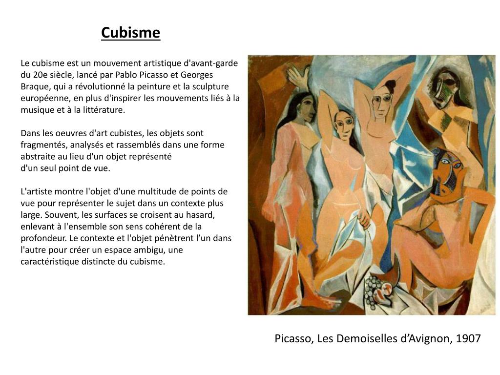 Cubisme Le cubisme est un mouvement artistique d'avant-garde du 20e siècle, lancé par Pablo Picasso et Georges Braque, qui a révolutionné la peinture et la sculpture européenne, en plus d'inspirer les mouvements liés à la musique et à la littérature. Dans les oeuvres d'art cubistes, les objets sont fragmentés, analysés et rassemblés dans une forme abstraite au lieu d'un objet représenté d'un seul point de vue. L'artiste montre l'objet d'une multitude de points de vue pour représenter le sujet dans un contexte plus large. Souvent, les surfaces se croisent au hasard, enlevant à l'ensemble son sens cohérent de la profondeur. Le contexte et l'objet pénètrent l’un dans l'autre pour créer un espace ambigu, une caractéristique distincte du cubisme. Picasso, Les Demoiselles d’Avignon, 1907