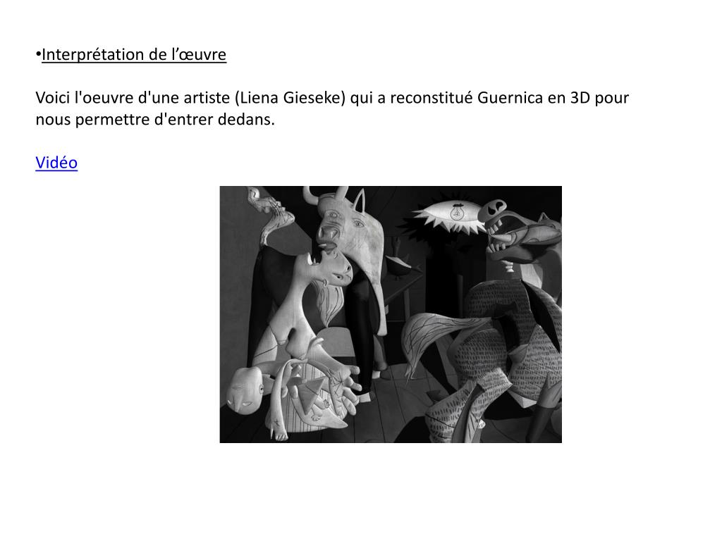 Interprétation de l’œuvre • Voici l'oeuvre d'une artiste (Liena Gieseke) qui a reconstitué Guernica en 3D pour nous permettre d'entrer dedans. • Vidéo