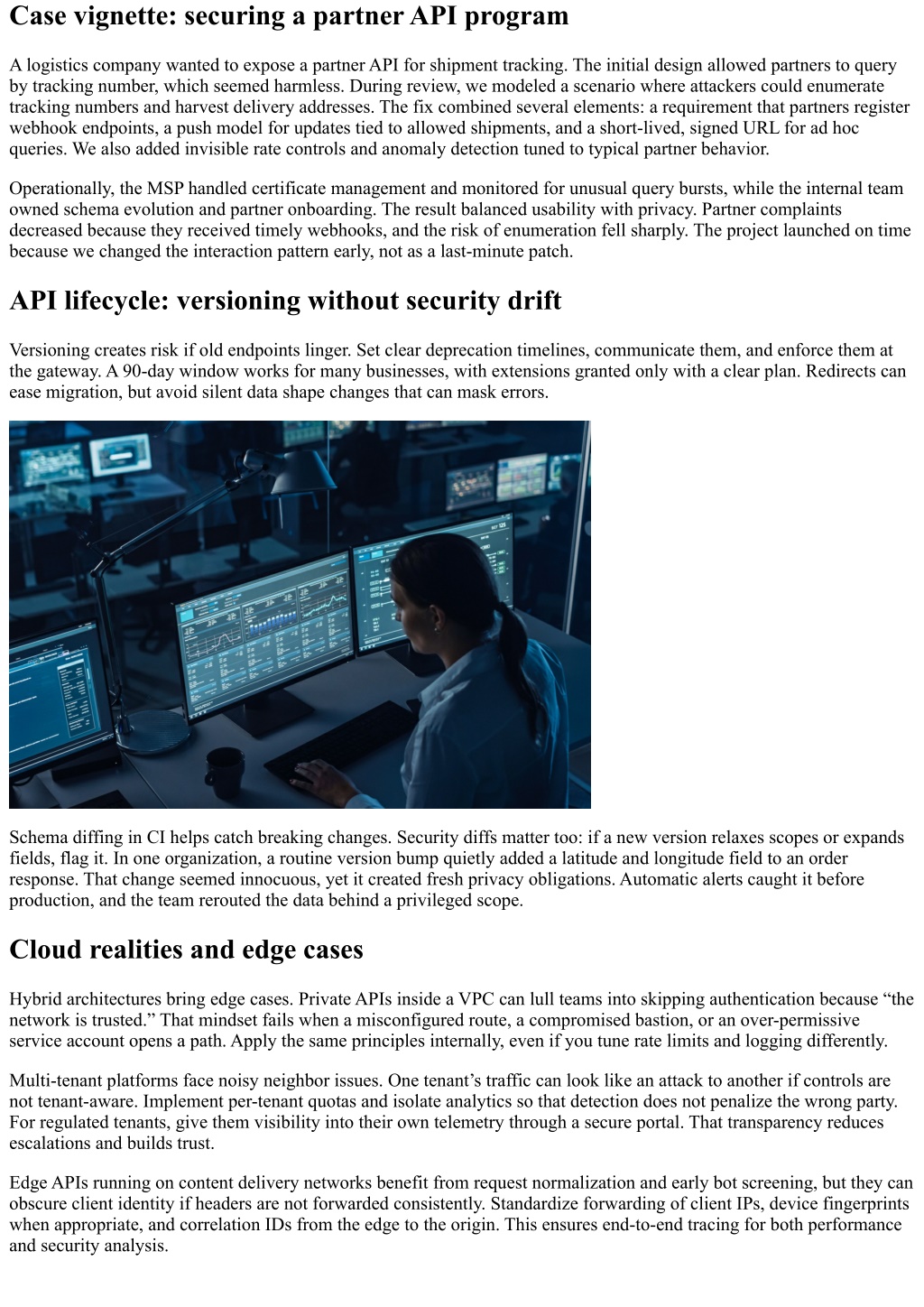 Case vignette: securing a partner API program A logistics company wanted to expose a partner API for shipment tracking. The initial design allowed partners to query by tracking number, which seemed harmless. During review, we modeled a scenario where attackers could enumerate tracking numbers and harvest delivery addresses. The fix combined several elements: a requirement that partners register webhook endpoints, a push model for updates tied to allowed shipments, and a short-lived, signed URL for ad hoc queries. We also added invisible rate controls and anomaly detection tuned to typical partner behavior. Operationally, the MSP handled certificate management and monitored for unusual query bursts, while the internal team owned schema evolution and partner onboarding. The result balanced usability with privacy. Partner complaints decreased because they received timely webhooks, and the risk of enumeration fell sharply. The project launched on time because we changed the interaction pattern early, not as a last-minute patch. API lifecycle: versioning without security drift Versioning creates risk if old endpoints linger. Set clear deprecation timelines, communicate them, and enforce them at the gateway. A 90-day window works for many businesses, with extensions granted only with a clear plan. Redirects can ease migration, but avoid silent data shape changes that can mask errors. Schema diffing in CI helps catch breaking changes. Security diffs matter too: if a new version relaxes scopes or expands fields, flag it. In one organization, a routine version bump quietly added a latitude and longitude field to an order response. That change seemed innocuous, yet it created fresh privacy obligations. Automatic alerts caught it before production, and the team rerouted the data behind a privileged scope. Cloud realities and edge cases Hybrid architectures bring edge cases. Private APIs inside a VPC can lull teams into skipping authentication because “the network is trusted.” That mindset fails when a misconfigured route, a compromised bastion, or an over-permissive service account opens a path. Apply the same principles internally, even if you tune rate limits and logging differently. Multi-tenant platforms face noisy neighbor issues. One tenant’s traffic can look like an attack to another if controls are not tenant-aware. Implement per-tenant quotas and isolate analytics so that detection does not penalize the wrong party. For regulated tenants, give them visibility into their own telemetry through a secure portal. That transparency reduces escalations and builds trust. Edge APIs running on content delivery networks benefit from request normalization and early bot screening, but they can obscure client identity if headers are not forwarded consistently. Standardize forwarding of client IPs, device fingerprints when appropriate, and correlation IDs from the edge to the origin. This ensures end-to-end tracing for both performance and security analysis.