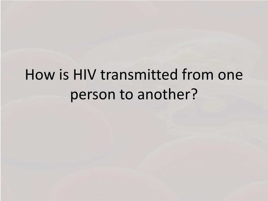 Ways HIV Is Transmitted • During vaginal, oral or anal sex. • By sharing needles and equipment to inject drugs. • By sharing needles used for tattoos and piercings. • By sharing needles used to inject vitamins or steroids. • From unintentional needlestick injuries in a hospital or clinic. • From a mother to her baby during pregnancy, childbirth or breastfeeding.