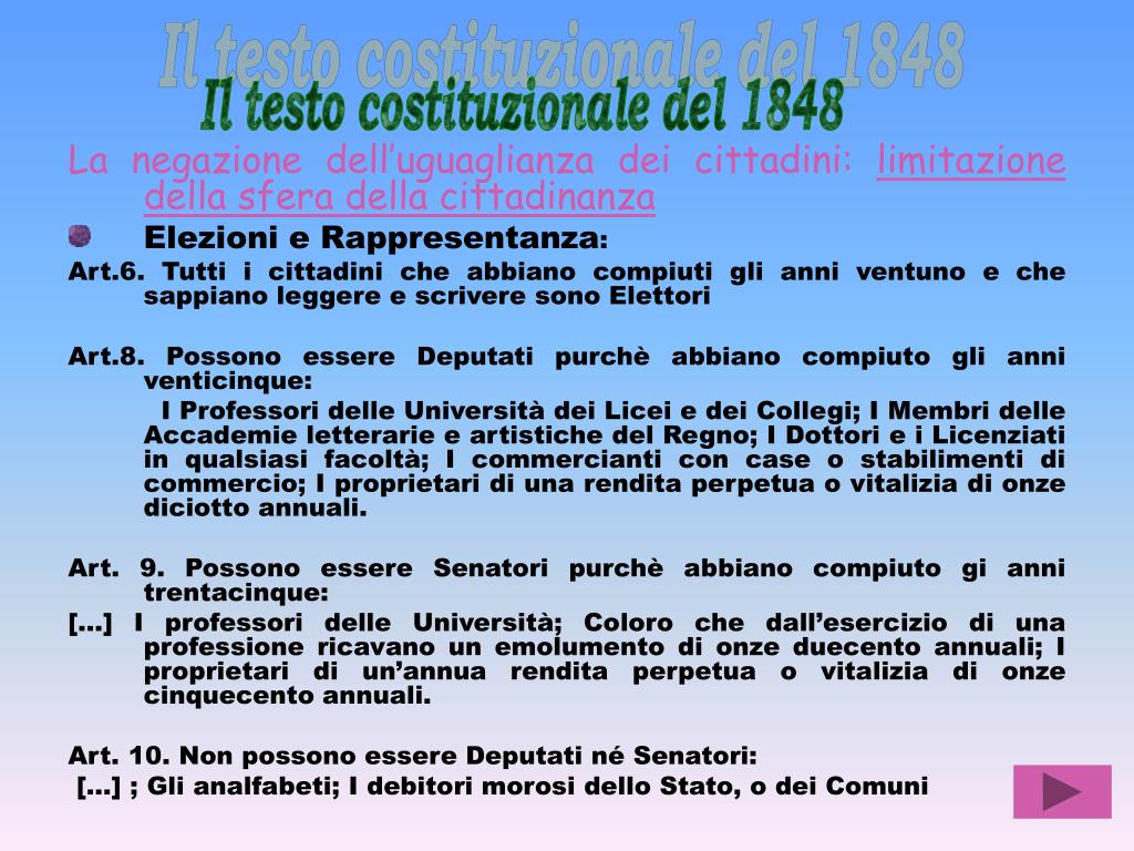 Il testo costituzionale del 1848 La negazione dell’uguaglianza dei cittadini: limitazione della sfera della cittadinanza • Elezioni e Rappresentanza: Art.6. Tutti i cittadini che abbiano compiuti gli anni ventuno e che sappiano leggere e scrivere sono Elettori Art.8. Possono essere Deputati purchè abbiano compiuto gli anni venticinque: I Professori delle Università dei Licei e dei Collegi; I Membri delle Accademie letterarie e artistiche del Regno; I Dottori e i Licenziati in qualsiasi facoltà; I commercianti con case o stabilimenti di commercio; I proprietari di una rendita perpetua o vitalizia di onze diciotto annuali. Art. 9. Possono essere Senatori purchè abbiano compiuto gi anni trentacinque: […] I professori delle Università; Coloro che dall’esercizio di una professione ricavano un emolumento di onze duecento annuali; I proprietari di un’annua rendita perpetua o vitalizia di onze cinquecento annuali. Art. 10. Non possono essere Deputati né Senatori: […] ; Gli analfabeti; I debitori morosi dello Stato, o dei Comuni