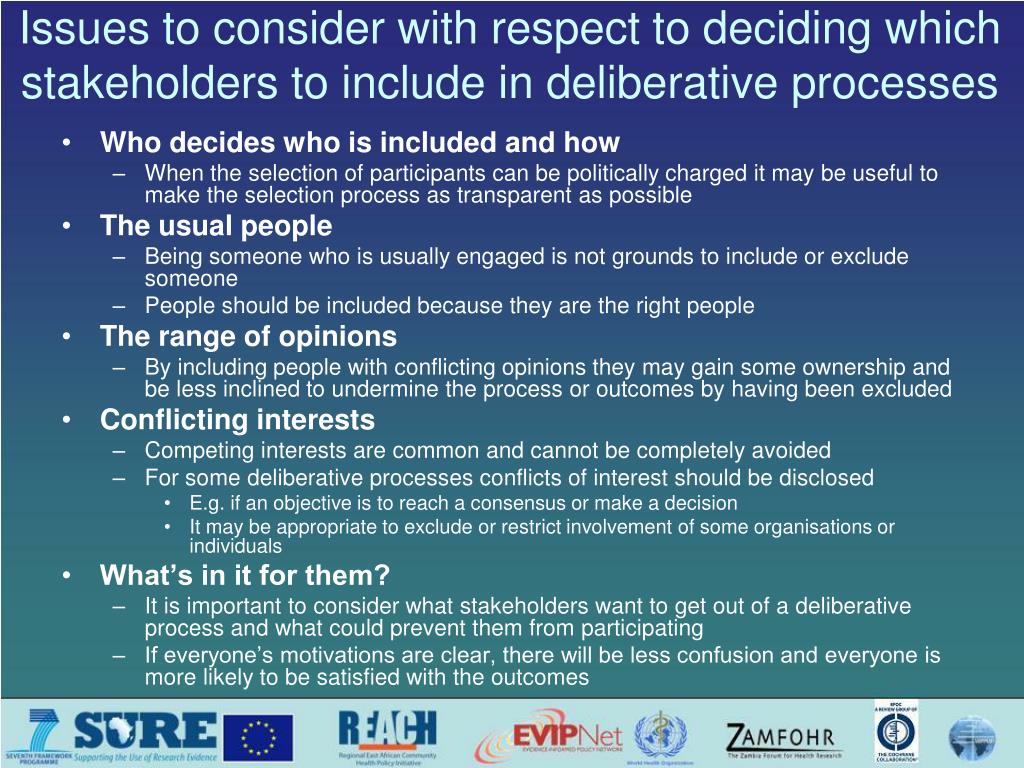 Engaging people, groups or organisations with an interest (stakeholders) in deliberations about health policies can help to ensure • Their concerns are addressed • Problems are analysed, described and perceived correctly • Appropriate solutions are identified • Important barriers to implementing solutions are considered • Effective implementation strategies are identified • Appropriate values are used when balancing the pros and cons of options • Policy decisions are appropriate, understood and acceptable