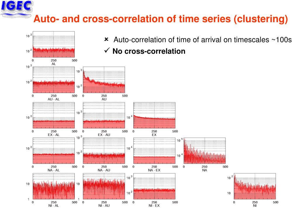 Auto- and cross-correlation of time series (clustering) Auto-correlation of time of arrival on timescales ~100s No cross-correlation