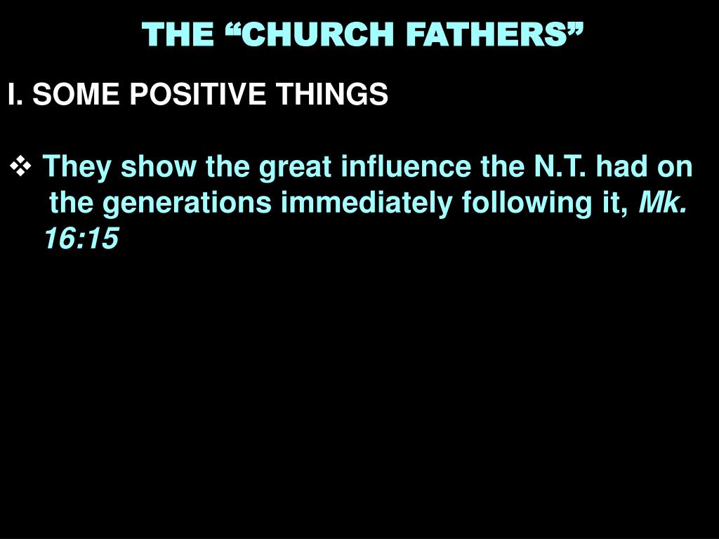 THE “CHURCH FATHERS” • I. SOME POSITIVE THINGS • They show the great influence the N.T. had on the generations immediately following it, Mk. 16:15