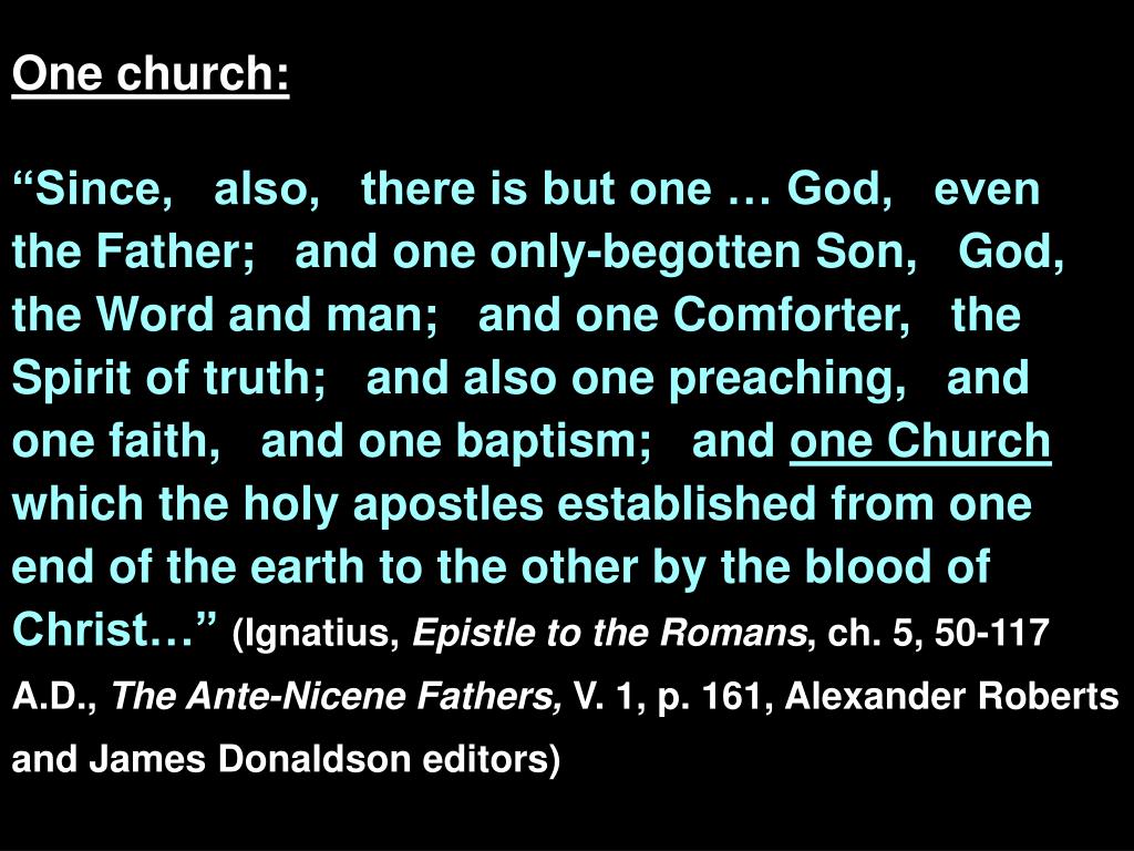 One church: “Since, also, there is but one … God, even the Father; and one only-begotten Son, God, the Word and man; and one Comforter, the Spirit of truth; and also one preaching, and one faith, and one baptism; and one Church which the holy apostles established from one end of the earth to the other by the blood of Christ…” (Ignatius, Epistle to the Romans, ch. 5, 50-117 A.D., The Ante-Nicene Fathers, V. 1, p. 161, Alexander Roberts and James Donaldson editors)