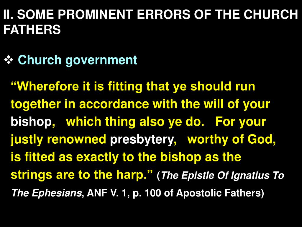 II. SOME PROMINENT ERRORS OF THE CHURCH FATHERS • Church government “Wherefore it is fitting that ye should run together in accordance with the will of your bishop, which thing also ye do. For your justly renowned presbytery, worthy of God, is fitted as exactly to the bishop as the strings are to the harp.” (The Epistle Of Ignatius To The Ephesians, ANF V. 1, p. 100 of Apostolic Fathers)