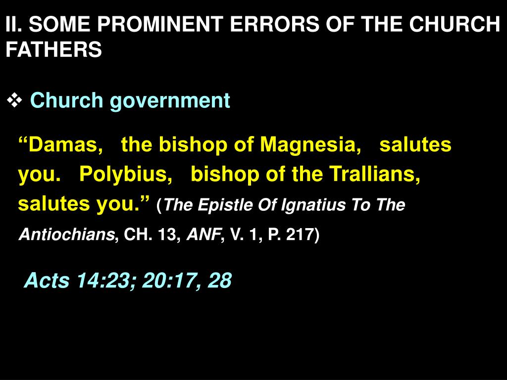 II. SOME PROMINENT ERRORS OF THE CHURCH FATHERS • Church government “Damas, the bishop of Magnesia, salutes you. Polybius, bishop of the Trallians, salutes you.” (The Epistle Of Ignatius To The Antiochians, CH. 13, ANF, V. 1, P. 217) Acts 14:23; 20:17, 28
