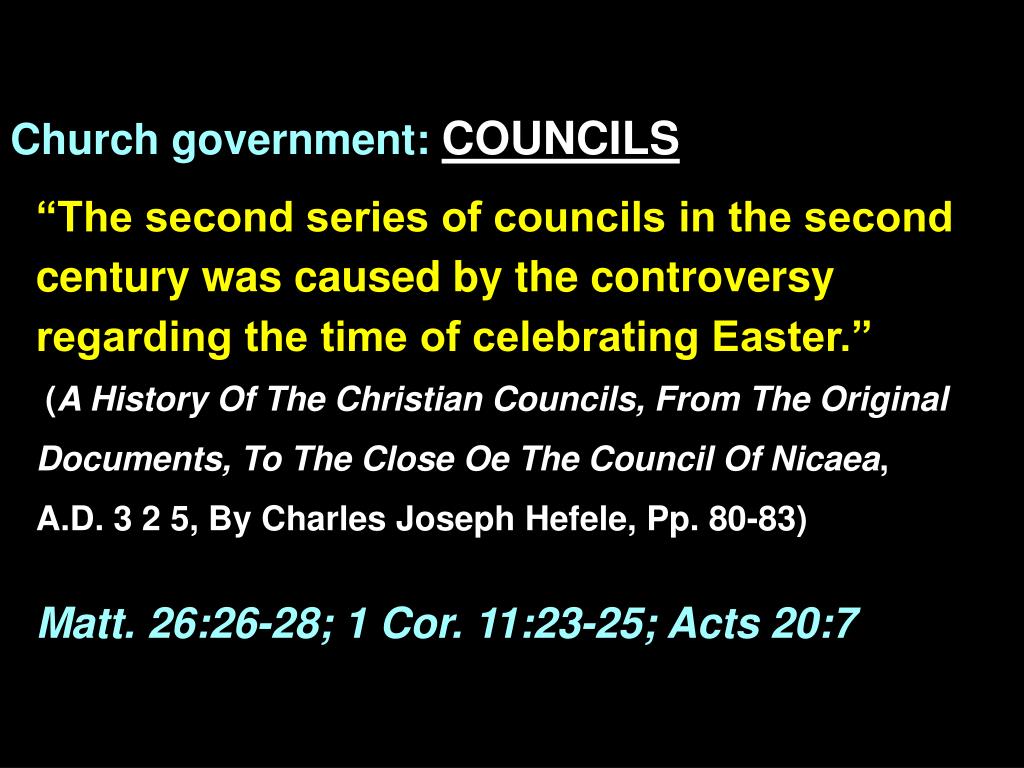 Church government: COUNCILS “The second series of councils in the second century was caused by the controversy regarding the time of celebrating Easter.” (A History Of The Christian Councils, From The Original Documents, To The Close Oe The Council Of Nicaea, A.D. 3 2 5, By Charles Joseph Hefele, Pp. 80-83) Matt. 26:26-28; 1 Cor. 11:23-25; Acts 20:7
