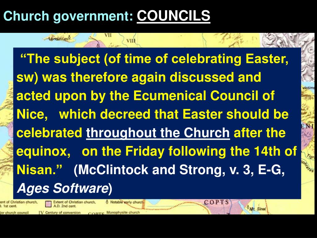 Church government: COUNCILS END OF SECOND CENTURY “The subject (of time of celebrating Easter, sw) was therefore again discussed and acted upon by the Ecumenical Council of Nice, which decreed that Easter should be celebrated throughout the Churchafter the equinox, on the Friday following the 14th of Nisan.” (McClintock and Strong, v. 3, E-G, Ages Software)