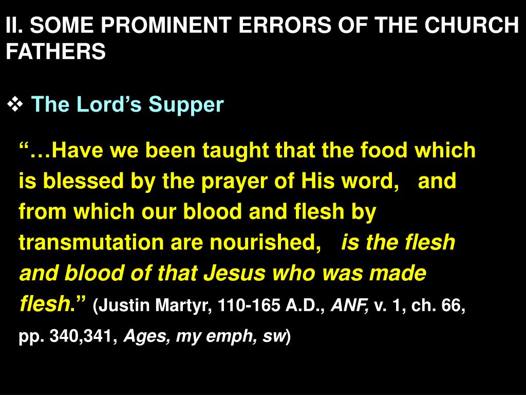II. SOME PROMINENT ERRORS OF THE CHURCH FATHERS • The Lord’s Supper “…Have we been taught that the food which is blessed by the prayer of His word, and from which our blood and flesh by transmutation are nourished, is the flesh and blood of that Jesus who was made flesh.” (Justin Martyr, 110-165 A.D., ANF, v. 1, ch. 66, pp. 340,341, Ages, my emph, sw)