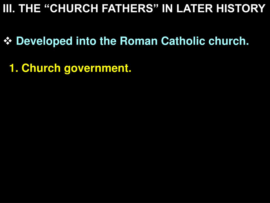III. THE “CHURCH FATHERS” IN LATER HISTORY • Developed into the Roman Catholic church. • 1. Church government • “…While your bishop presides in the place of God”(Ignatius, The Epistle Of Ignatius To The Magnesians, Ch. 6, ANF, P. 123)