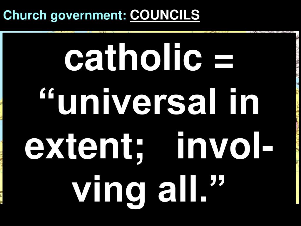 Church government: COUNCILS “From that time councils became frequent; but as they consisted only of those who belonged to particular districts or countries, they are usually termed diocesan, provincial, patriarchal, or national councils, in contradistinction to ecumenical or, general councils, i.e. supposed to comprise delegates or commissioners from all the churches in the Christian world…” (McClintock and Strong, v. 2, C-D, Ages Software)