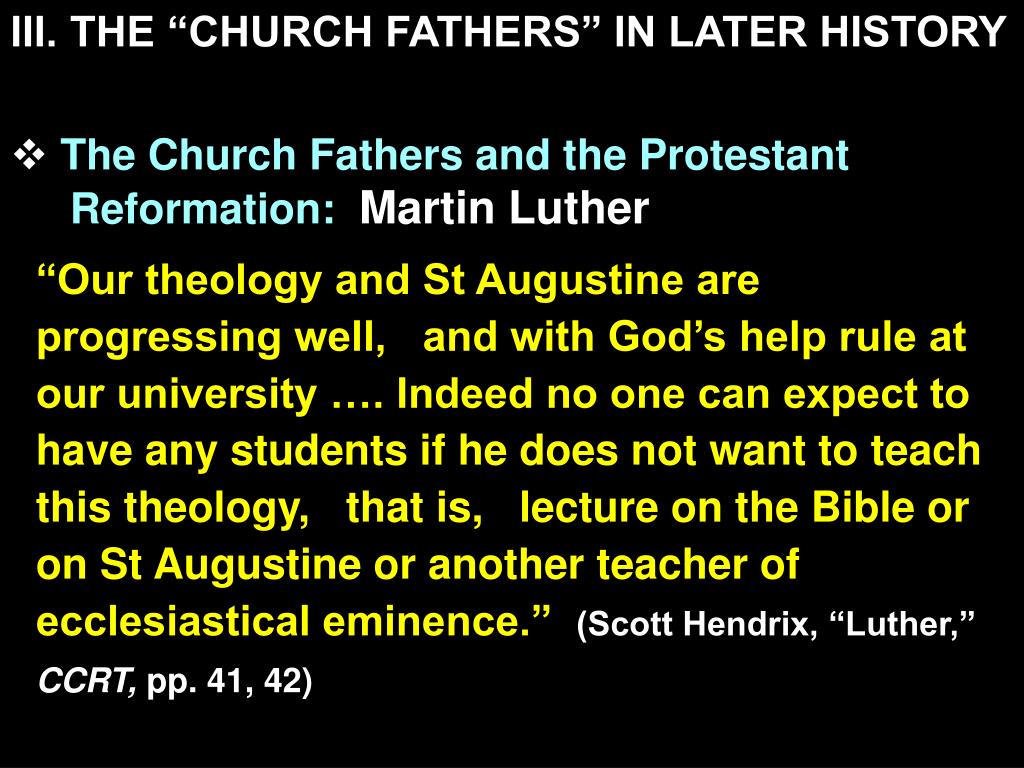 III. THE “CHURCH FATHERS” IN LATER HISTORY • The Church Fathers and the Protestant Reformation: Martin Luther “Our theology and St Augustine are progressing well, and with God’s help rule at our university …. Indeed no one can expect to have any students if he does not want to teach this theology, that is, lecture on the Bible or on St Augustine or another teacher of ecclesiastical eminence.” (Scott Hendrix, “Luther,” CCRT, pp. 41, 42)