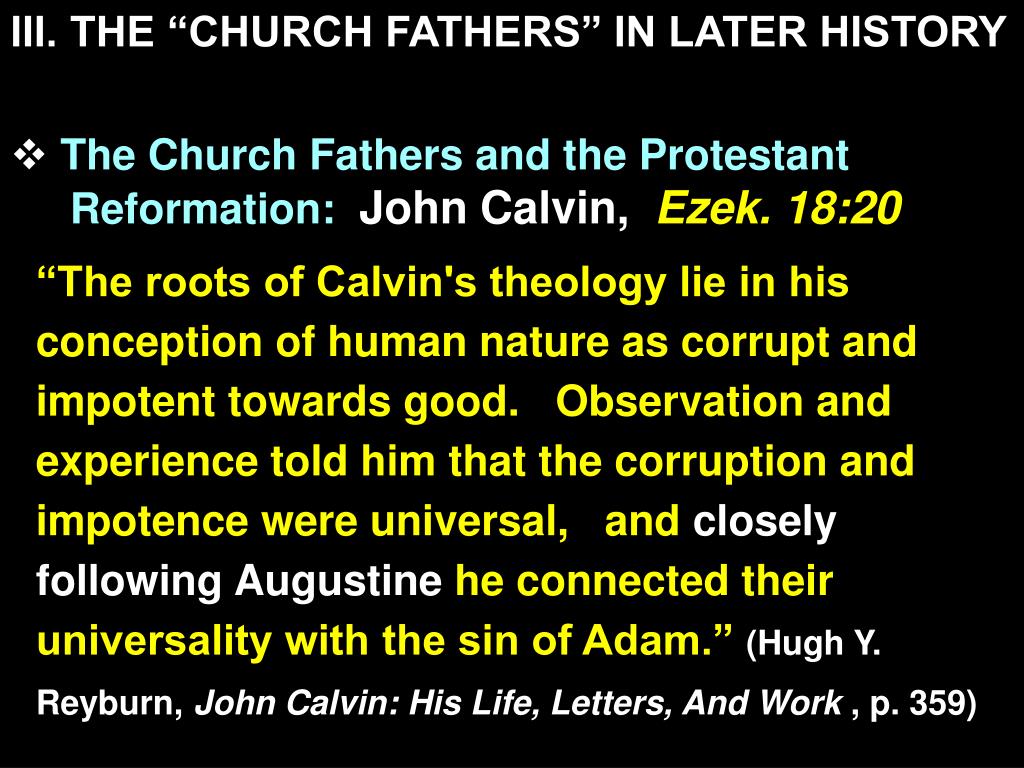 III. THE “CHURCH FATHERS” IN LATER HISTORY • The Church Fathers and the Protestant Reformation: John Calvin, Ezek. 18:20 “The roots of Calvin's theology lie in his conception of human nature as corrupt and impotent towards good. Observation and experience told him that the corruption and impotence were universal, and closely following Augustine he connected their universality with the sin of Adam.” (Hugh Y. Reyburn, John Calvin: His Life, Letters, And Work , p. 359)