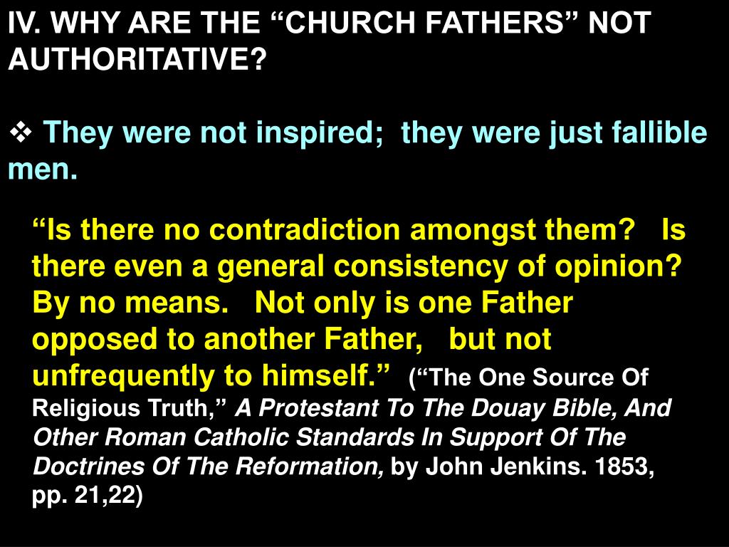 IV. WHY ARE THE “CHURCH FATHERS” NOT AUTHORITATIVE? • They were not inspired; they were just fallible men. “Is there no contradiction amongst them? Is there even a general consistency of opinion? By no means. Not only is one Father opposed to another Father, but not unfrequently to himself.” (“The One Source Of Religious Truth,” A Protestant To The Douay Bible, And Other Roman Catholic Standards In Support Of The Doctrines Of The Reformation, by John Jenkins. 1853, pp. 21,22)