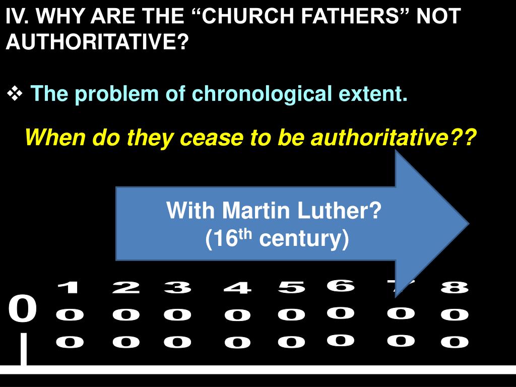 IV. WHY ARE THE “CHURCH FATHERS” NOT AUTHORITATIVE? • The problem of chronological extent. When do they cease to be authoritative?? With Martin Luther? (16th century) 0 600 700 100 200 300 500 800 400