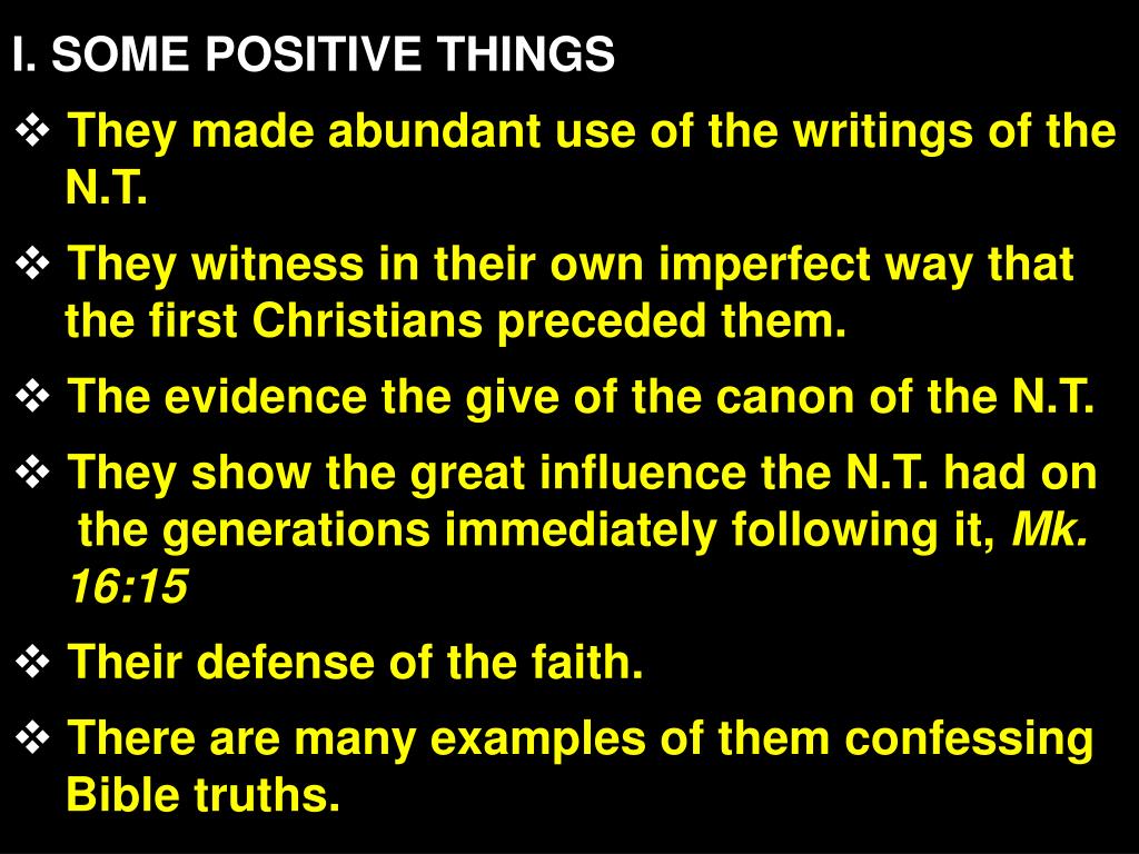I. SOME POSITIVE THINGS • They made abundant use of the writings of the N.T. • They witness in their own imperfect way that the first Christians preceded them. • The evidence the give of the canon of the N.T. • They show the great influence the N.T. had on the generations immediately following it, Mk. 16:15 • Their defense of the faith. • There are many examples of them confessing Bible truths.