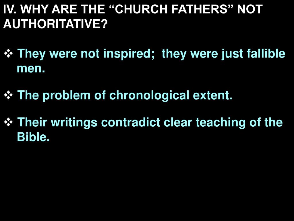 IV. WHY ARE THE “CHURCH FATHERS” NOT AUTHORITATIVE? • They were not inspired; they were just fallible men. • The problem of chronological extent. • Their writings contradict clear teaching of the Bible.